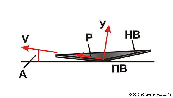 Схема, поясняющая аэродинамический принцип создания подъемной силы несущим винтом вертолета. На схеме: A — угол атаки крыла; V — скорость полета; У — подъемная сила; Р — тяга; НВ — несущий винт; ПВ — плоскость вращения несущего винта.
