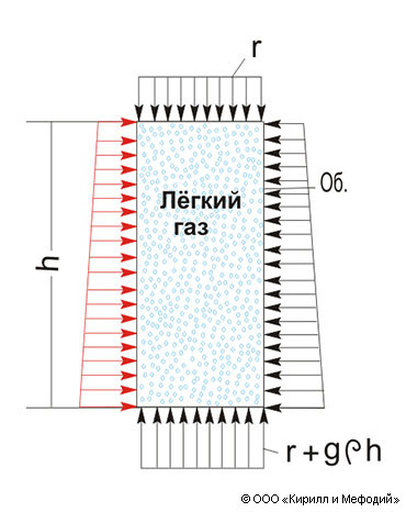 Схема, поясняющая аэростатический принцип создания подъемной силы. На схеме: р — давление воздуха; r — плотность воздуха; g — ускорение силы тяжести; h — высота аэростата; Об. — оболочка аэростата. Стрелками показано распределение давления на поверхности летательного аппарата, окруженного воздухом.