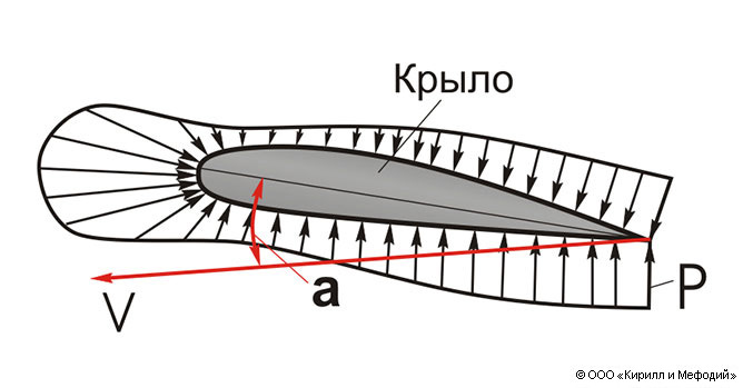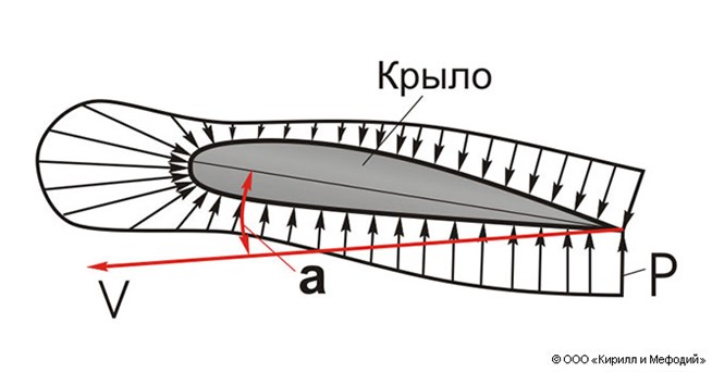 Схема, поясняющая аэродинамический принцип создания подъемной силы крылом дозвукового самолета. На схеме: p — давление воздуха; a — угол атаки крыла; V — скорость полета. Стрелками показано распределение давления на поверхности крыла.