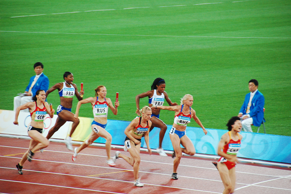 Александра Федорива передает эстафетную палочку Юлии Гущиной. Девушки завоевали золото в олимпийской эстафете 4х100. Пекин, Китай, 2008 год. Фото: morgann, flickr