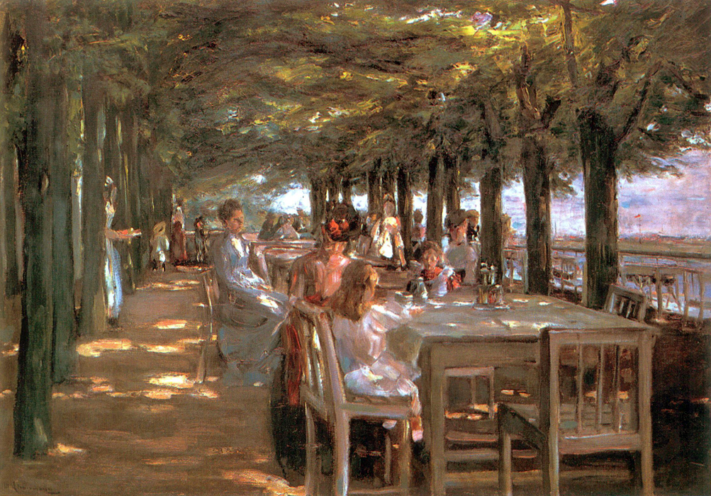 Макс Либерман. Терраса ресторана «Якоб» в Нинштедтене на Эльбе. 1902 год. Холст, масло. Кунстхалле, Гамбург. Нинштедтен — район Гамбурга, расположенный на северном берегу Эльбы.