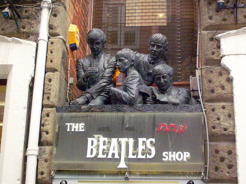 Ливерпуль. Скульптурная группа «Битлз» над входом в магазин на Мютью-стрит.