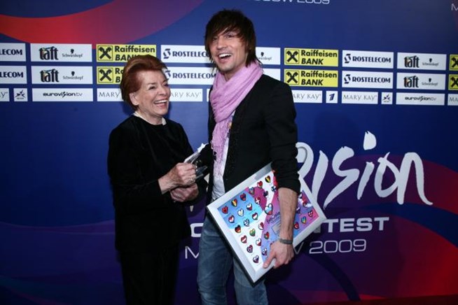 Лиз Ассиа - победительница первого конкурса «Евровидение» 1956 года, и Дима Билан - российский победитель «Евровидения» 2008 года. Москва, Россия. 2009 год. Фото: wikimedia.org