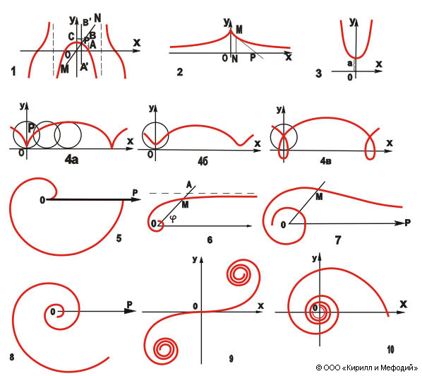 Трансцендентные кривые: 1 — квадратриса; 2 — трактриса; 3 — цепная линия; 4 — циклоида; 5 — архимедова спираль; 6 — гиперболическая спираль; 7 — жезл; 8 — логарифмическая спираль; 9 — спираль Корню; 10 — si-ci-cпираль.