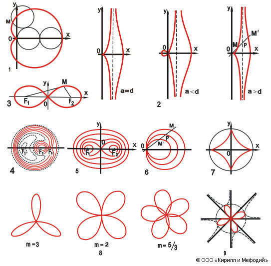 Алгебраические кривые четвертого и более высоких порядков: 1 — кардиоида; 2 — конхоида Никомеда; 3 — лемниската Бернулли: 4 — овалы Декарта; 5 — овалы Кассини; 6 — улитка Паскаля; 7 — астроида; 8 — розы; 9 — синус-спираль.