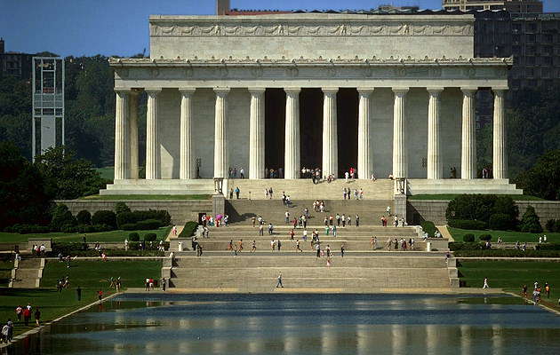 Общий вид мемориального комплекса в Вашингтоне, посвященного президенту Линкольну. Расположен в парке на берегу Потомака. Широкие ступени ведут к 36 колоннам (по числу штатов во времена президентства Линкольна), за которыми находится грандиозная скульптура выдающегося американского президента.