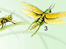У наиболее древних крылатых насекомых наблюдается неполное превращение. В ходе его последовательно сменяются три стадии: яйцо (1) - личинка (2) - взрослое насекомое (3).