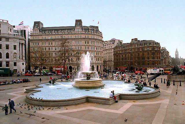 Трафальгарская площадь (Трафальгар-Сквер), на которой расположена Национальная галерея, основанная в 1824 (на снимке на заднем плане). Одно из известнейших мест города, здесь проводятся обычно митинги и демонстрации. Площадь названа в честь самой знаменитой из побед адмирала Нельсона.
