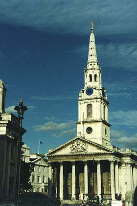 Лондон. Церковь Св. Мартина в Полях возведена по проекту архитектора Джеймса Гиббса в 1726 г. Здесь покоятся живописцы Уильям Хогарт и Джошуа Рейнолдс, а также фаворитка Карла II Стюарта актриса Нелл Гвин.