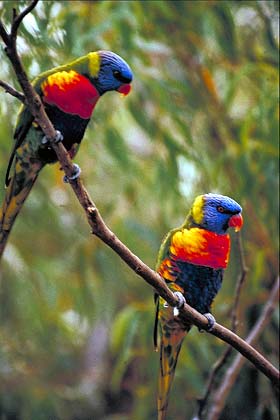 Радужные, или многоцветные, лорикеты получили название благодаря своей сияющей окраске. Эти попугаи легко привыкают к человеку и часто содержатся в неволе. Данные птицы сняты в их естественной среде обитания в Австралии.