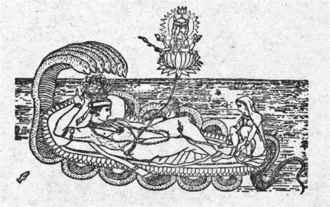 Вишну и Лакшми, наблюдающие за творением: Брахма вырастает из цветка лотоса, берущего начало из пупка Вишну