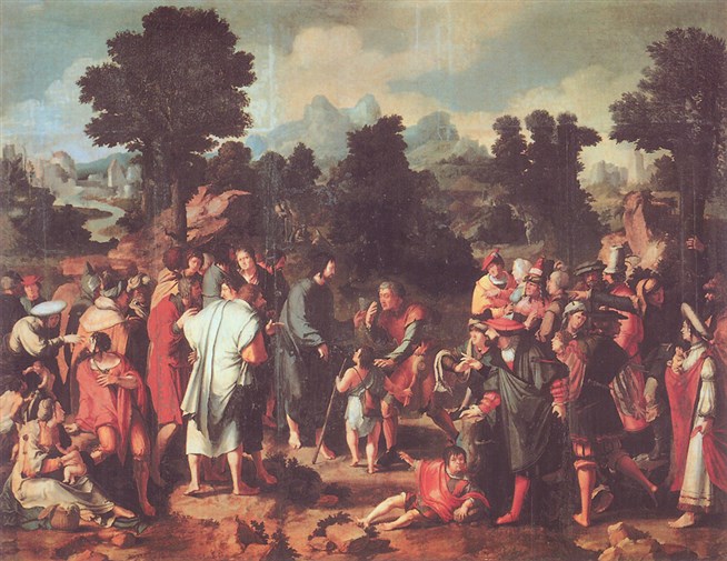 Лука Лейденский. Исцеление иерихонского святого. Центральная часть триптиха. 1531 год. Холст, масло. Эрмитаж, Петербург.