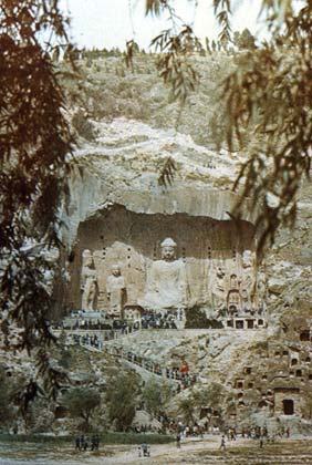 Лунмынь. Статуя Будды Локаны (санскрит. Вайрочана) — божества космического света, озаряющего людям путь к спасению. Будда окружен свитой последователей. 7 век.