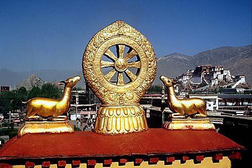 По преданию, среди первых слушателей Будды ему внимали две газели, изображения которых по обе стороны восьмирадиусного (8 спиц Колеса символизируют 8 этапов буддийского Благородного Пути) Колеса Учения (Дхармачакра) стали символом буддизма.