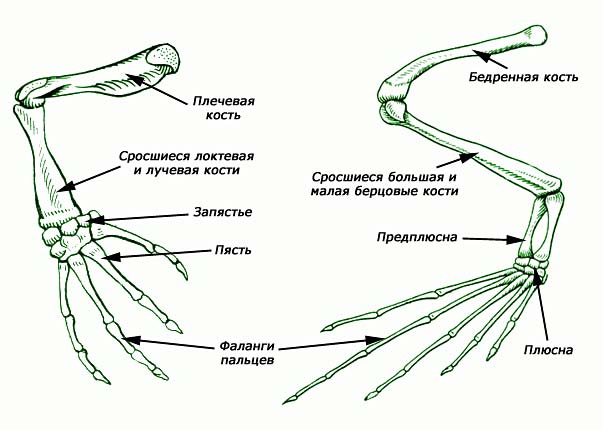 Передние конечности лягушки состоят из плеча, предплечья и кисти, а задние - из бедра, голени и стопы. Локтевая и лучевая, а также большая и малая берцовые кости у лягушки срастаются.