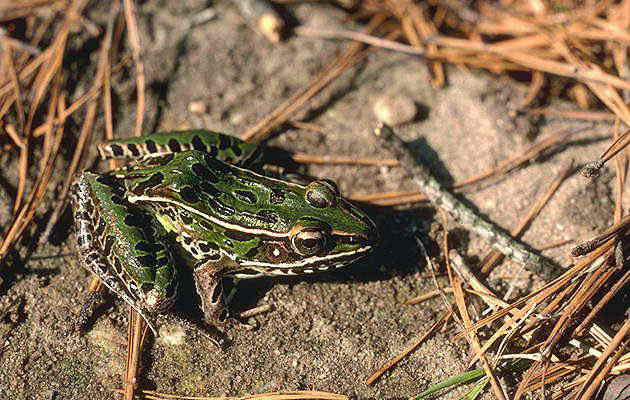 Одна из самых красивых североамериканских лягушек - леопардовая (Rana pipiens) - ведет наземный образ жизни, заходя в воду главным образом на время размножения. Обширный ареал этого земноводного занимает большую часть Северной и Центральной Америки.