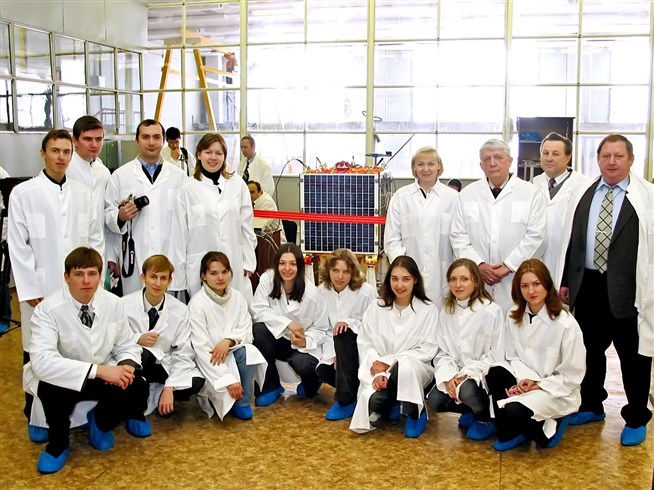 Студенческий микроспутник «Бауманец» и его создатели. В центре — руководитель Молодежного космического центра МГТУ профессор В.И. Майорова. 2006 год. Фото из архива Музея МГТУ.