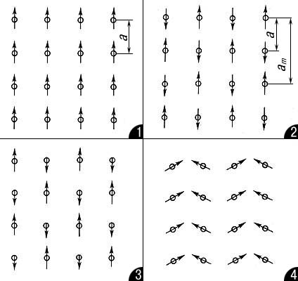 Типы магнитных структур: 1 — ферромагнитная; 2 — антиферромагнитная; 3 — ферримагнитная; 4 — слабоферромагнитная; а и am — соответственно периоды атомной и магнитной структур.