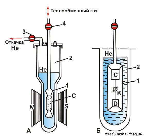 Схемы установок для магнитного охлаждения: А — одноступенчатого (N, S — полюсы электромагнита), Б — двухступенчатого; C, D — парамагнитные соли; 1 — камера; 2 — криостат; 3, 4, 5 — краны; К — тепловой ключ.