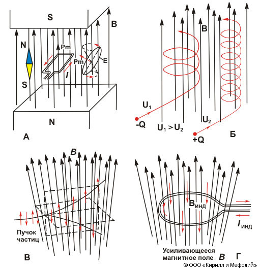 Действие магнитного поля: А — действие однородного постоянного магнитного поля на магнитную стрелку, виток с током I и атомный диполь (е — электрон атома); Б — действие однородного постоянного магнитного поля на свободно движущиеся электрические заряды q (их траектория в общем случае имеет вид спирали); В — разделение пучка магнитных диполей в неоднородном магнитном поле; Г — возникновение тока индукции в витке при усилении внешнего магнитного поля В (стрелками показано направление тока индукции и создаваемого магнитного поля Винд). Здесь Рm — магнитный момент, q — электрический заряд, U — скорость заряда, В - линии индукции магнитного поля.