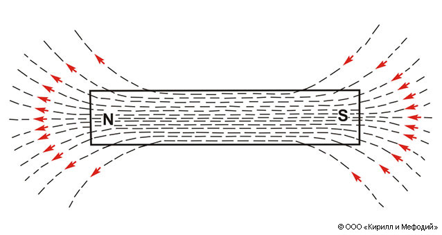 Магнитное поле и полюсы (N и S) намагниченного стального стержня. Линиями со стрелками обозначены линии магнитной индукции (линии замыкаются в окружающем стержень пространстве).