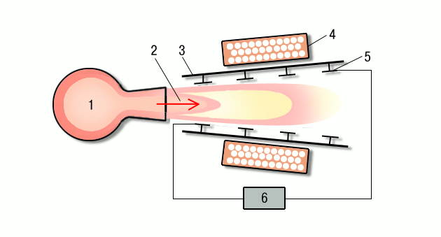 Магнитогидродинамический генератор (простейшая схема): 1 — источник ионизованного газа; 2 — ионизованный газ; 3 — канал, по которому подается плазма; 4 — электромагнит; 5 — электроды; 6 — нагрузка.
