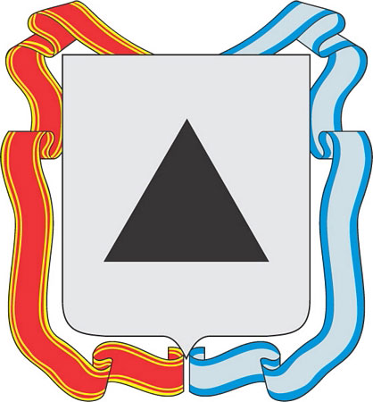 Герб Магнитогорска, принятый 29 января 2003 года. В серебряном поле черная пирамида, щитом ленты орденов Ленина и Трудового Красного Знамени.