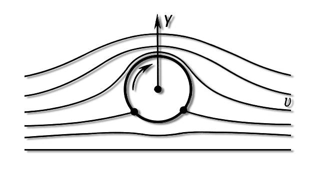 Эффект Магнуса. Линии тока и направление поперечной силы Y при обтекании кругового цилиндра, где v — скорость потока.