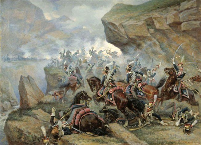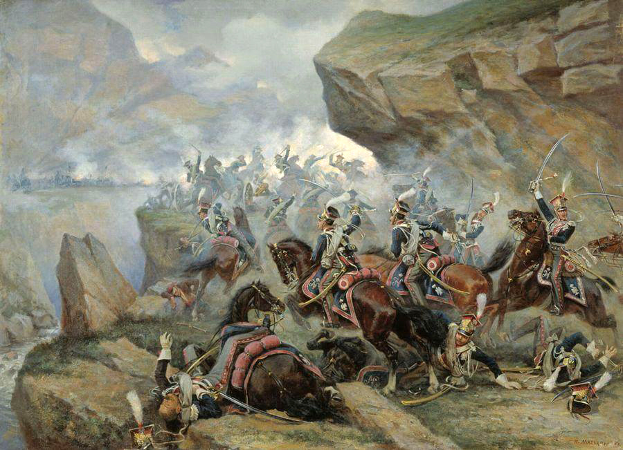 Виктор Викентьевич Мазуровский (1859-1944). Атака Первого гвардейского польского уланского полка на испанскую батарею в сражении при Сомосьерре 30 ноября 1808 года. 1900 год. Холст, масло. Центральный военно-исторический музей артиллерии, инженерных войск и войск связи, Петербург.