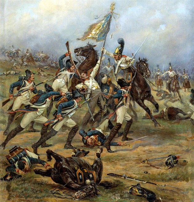 Виктор Викентьевич Мазуровский (1859-1944). Бой за знамя. Подвиг лейб-гвардии Конного полка в сражении при Аустерлице. Холст, масло. Брянский художественный музей.