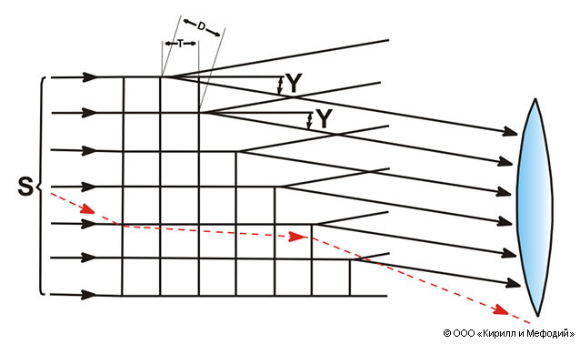 Ход лучей в прозрачном эшелоне Майкельсона. Исходный пучок света S направляют на эшелон под углом, очень мало отличающимся от прямого. Поэтому крайне мал и угол дифракции Y-лучей, прошедших через эшелон (штриховой линией показан ход луча при наклонном падении). D — разность хода лучей от соседних ступенек, близкая к высоте ступеньки T.