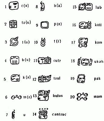 Некоторые слоговые знаки майя, дешифрованные в 1950-х годах Ю. В. Кнорозовым, и образцы использования их при фонетическом написании.
