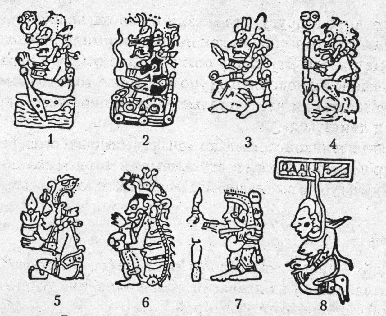 Боги майя (рисунки из рукописей майя): 1 — Сек Шиб Чак; 2 — Эк Шиб Чак; 3 — К'ан Шиб Чак; 4 — Чак Шиб Чак; 5 — бог кукурузы; 6 — бог смерти; 7 — бог войны; 8 — богиня Иш Таб