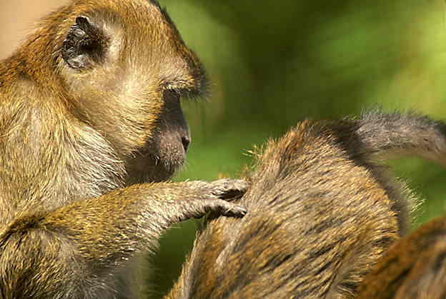 Макаки, живущие большими группами с ярко выраженной иерархией, общаются при помощи сложной системы звуков и жестов. Так, широко распространена процедура обыскивания друг друга как выражение личной симпатии или подчинения.