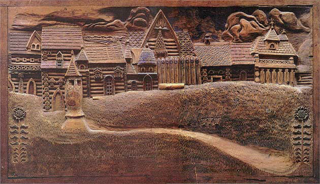 С. В. Малютин. «Городок». Дерево, резьба, темпера. 1890-е годы. Третьяковская галерея.