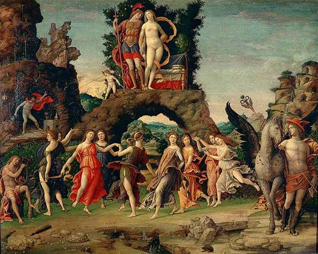Андреа Мантенья. Парнас. 1497 год. Холст. Лувр, Париж. Полотно написано для украшения кабинета Изабеллы д'Эсте в напоминание ее свадьбы с Джанфранческо Гонзаго в 1490 году. Главные персонажи картины — Марс и Венера изображены в окружении богов и героев. Композиция персонажей соответствует расположению звезд и планет в день бракосочетания. Марс и Венера избражены на каменном пьедестале на фоне ветвей с плодами — символа верности и любви. Амур насмехается над Плутоном, потерпевшим неудачу у Венеры, что подсказывает его изображение обнаженным. Внизу музы танцуют под кифару Аполлона.