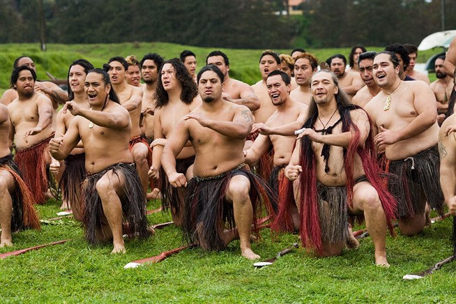 Мужчины маори исполняют танец воинов с веслами тайаха. 2006 год. Фото: Jorge Royan, wikimedia.org