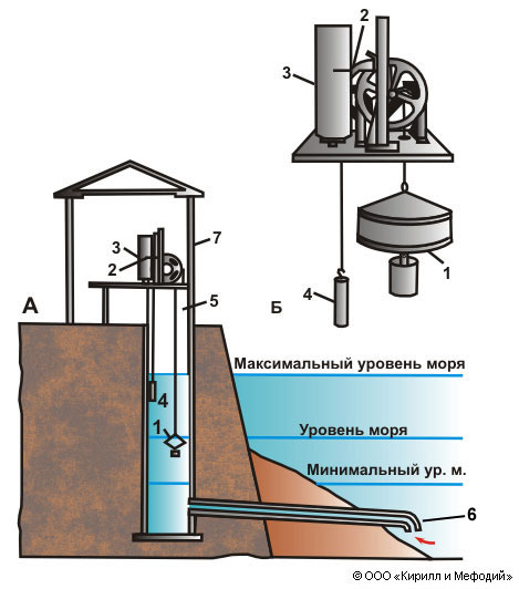 Схема установки мареографа СУМ в колодце (А) и его устройство (Б): 1 — поплавок; 2 — перо; 3 — барабан с диаграммной лентой; 4 — противовес; 5 — колодец; 6 — труба, соединяющая колодец с морем; 7 — будка, в которой устанавливается прибор.