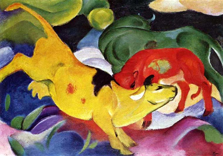 Франц Марк. Коровы — красная, желтая, зеленая. 1912 год. Холст. Дом Ленбаха, Мюнхен.