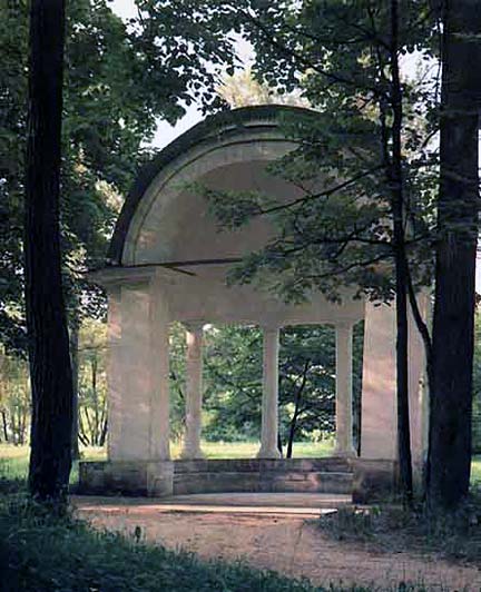 Музыкальный павильон имеет полуциркулярную форму. Строгая тосканская колоннада из белого камня, поставленная полукругом, завершается полукупольным сводом. Внутри - белокаменная скамейка, повторяющая форму павильона.