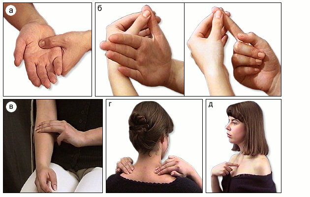 Массаж Шиацу для повышения работоспособности: а) в центре ладони; б) подушечек пальцев рук; в) предплечья; д) надплечья; г) а центре рукоятки грудины.