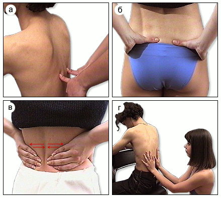 Массаж Шиацу при люмбаго: а) давление выше боли; б) на нижней границе боли; в) растирание в поясничной области; г) поглаживание поясницы.