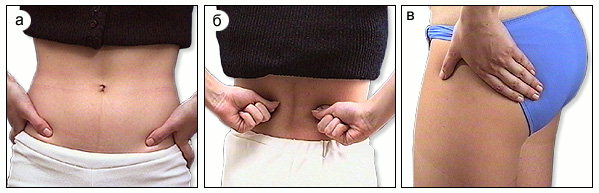 Массаж Шиацу при боли и напряжении мышц поясницы: а) надавливание на выпуклый край подвздошных костей; б) надавливание в области поясницы; в) вращательный массаж с вибрацией на ягодичных мышцах.