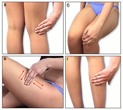Массаж Шиацу при болях в коленных суставах: а) под коленной складкой; б) поглаживание всего сустава; в) в области верхней трети бедра; г) в области голени.