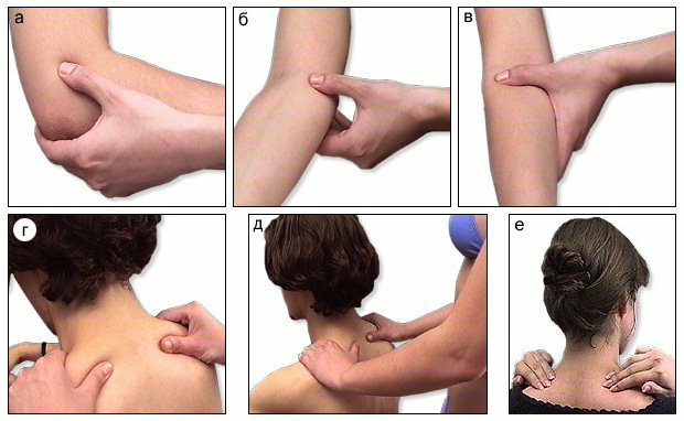 Массаж Шиацу при болях в локтевом суставе: а) на середине наружной локтевой складки и на складке локтевого сустава; б) с локтевой стороны;в) с лучевой стороны; г), д), е) мышц надплечья.