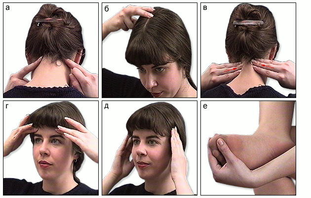 Шиацу на точки: а) в области затылка; б) в зоне макушки; в) в области шеи с надавливанием и растиранием; г) д) поглаживание области лба с переходом на область виска, е) подушечки пальцев ног.