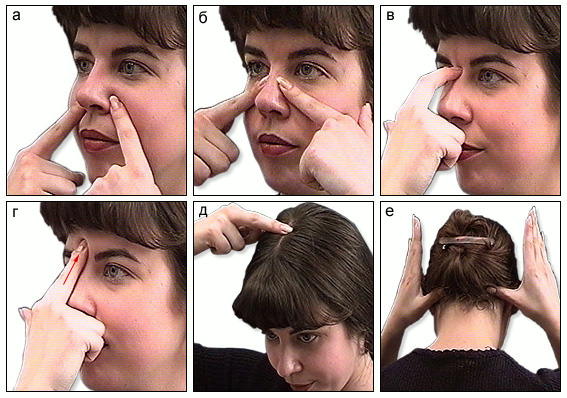 Массаж Шиацу при гайморите: а), б) у крыльев носа; в) у корня носа; г) на линии лба до роста волос; д) в области темени; е) в области затылка.