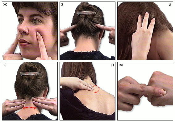 Массаж Шиацу при гайморите: ж) под скуловой дугой; з), и) в области затылка; к) в области шеи; л) у основания шеи; м) у пястно-фалангового сочленения мизинца.