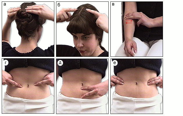 Массаж Шиацу при запорах: а) в зоне макушки; б) справа и слева в зоне макушки; в) на тыльно-лучевой поверхности предплечья; г), д), е) в области пупка.