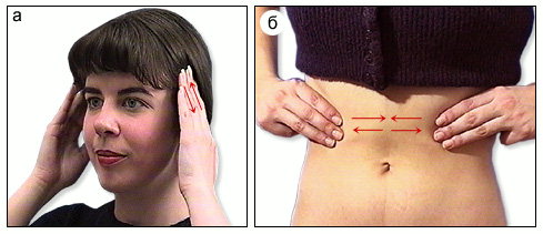 Массаж Шиацу при курсовом лечении мигрени в 6-ой день: a) точки височно-теменной области; б) в зоне реберной дуги.